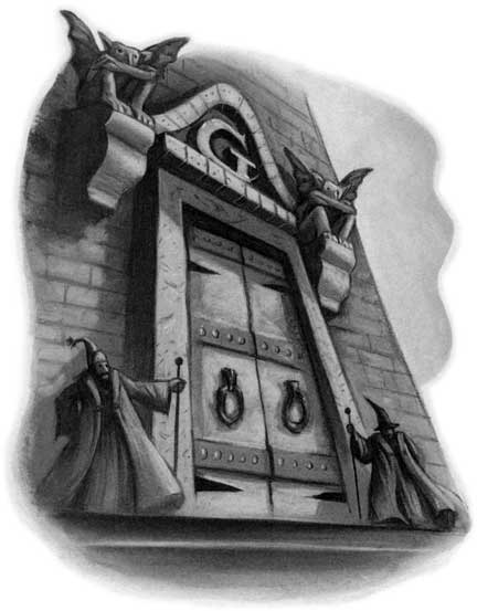 From Diagon Alley, a set of white stairs leads up to a set of burnished bronze doors. The doors are flanked by a goblin in a uniform of scarlet and gold, though during the Second Wizarding War the goblin was replaced instead by two wizard guards with Probity Probes. This is the entrance to Gringotts, and it leads into a small entrance hall and another set of doors.